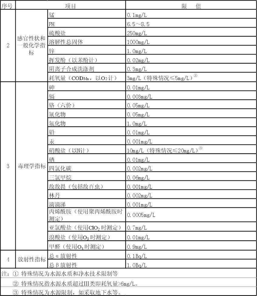 5 水源水質(zhì)要求 5.1 選用地表水作為供水水源時(shí),應(yīng)符合GB3838的要求。 選用地下水作為供水水源時(shí),應(yīng)符合GB/T14848的要求。 5.2 水源水質(zhì)的放射性指標(biāo),應(yīng)符合表1的規(guī)定。 5.3 當(dāng)水源水質(zhì)不符合要求時(shí),不宜作為供水水源。若限于條件需加以利用時(shí),水源水質(zhì)超標(biāo)項(xiàng)目經(jīng)自來(lái)水廠凈化處理后,應(yīng)達(dá)到本標(biāo)準(zhǔn)的要求。