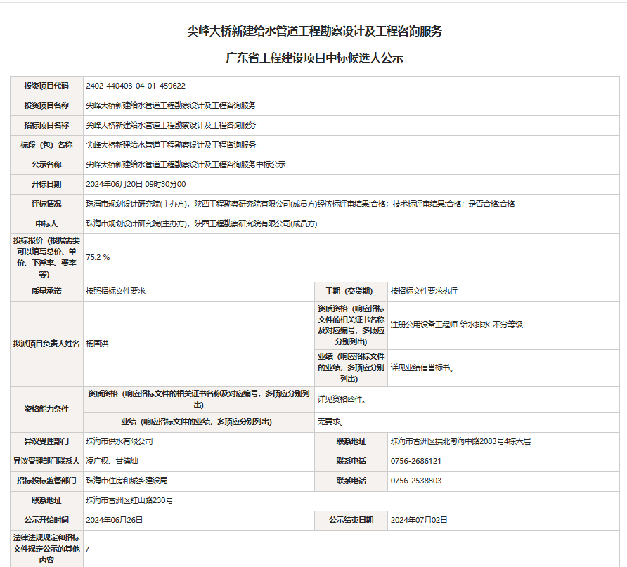 尖峰大橋新建給水管道工程勘察設(shè)計(jì)及工程咨詢服務(wù)中標(biāo)公示