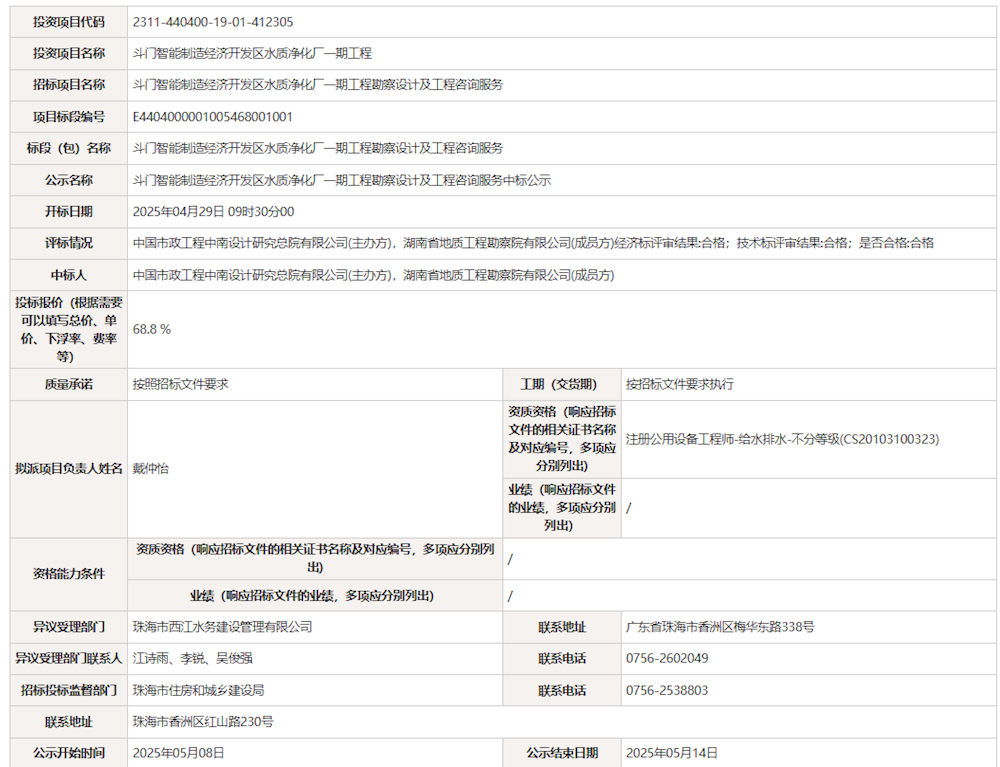 斗門智能制造經(jīng)濟開發(fā)區(qū)水質(zhì)凈化廠一期工程勘察設(shè)計及工程咨詢服務(wù)中標公示 發(fā)布時間:2025年05月08日 瀏覽次數(shù): 次 小大 【打印正文】