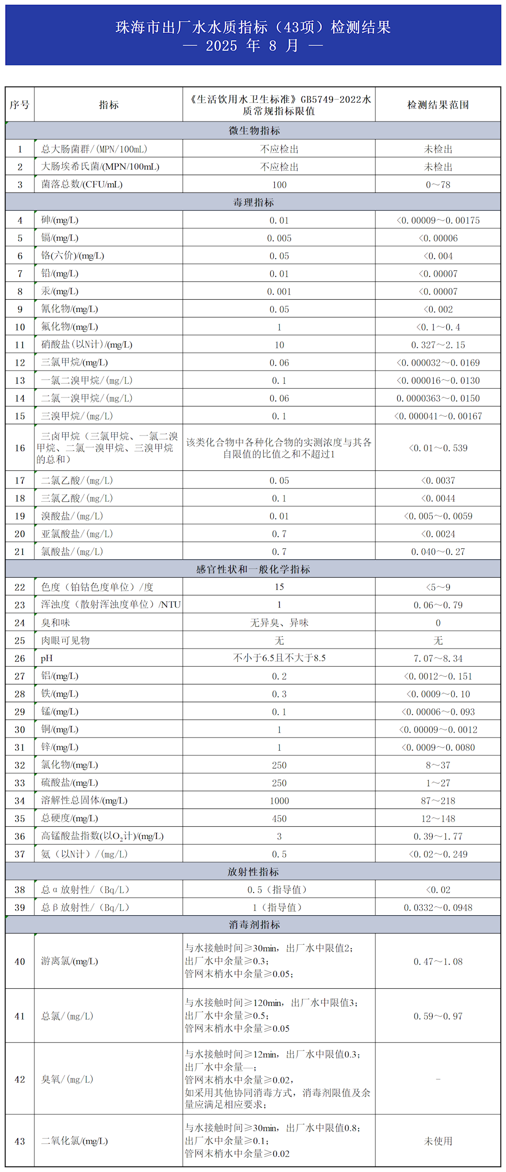 2025年8月珠海市出廠水水質(zhì)指標(biāo)(43項)檢測結(jié)果 發(fā)布時間:2025年09月15日 瀏覽次數(shù): 次 小大 原文下載:2025年8月珠海市出廠水水質(zhì)指標(biāo)(43項)檢測結(jié)果.xls 【打印正文】
