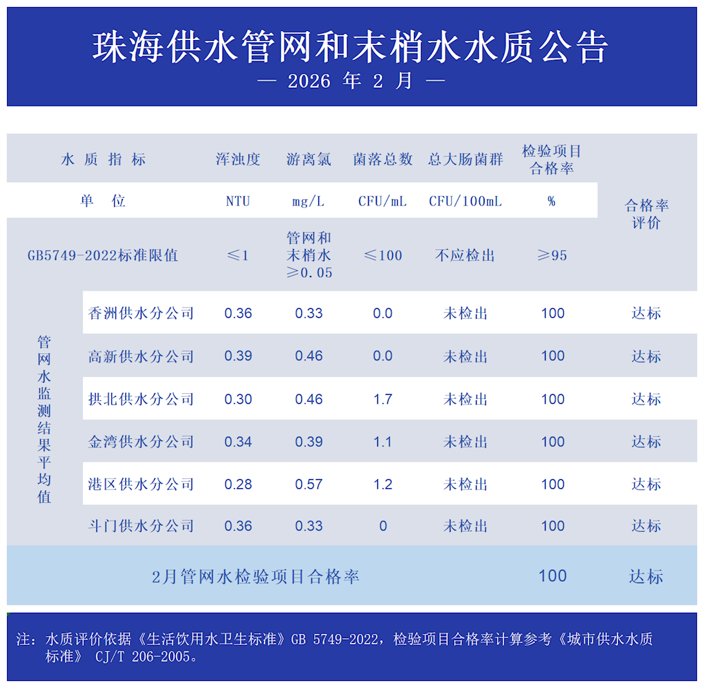 2026年2月珠海供水管網(wǎng)和末梢水水質(zhì)公告 發(fā)布時(shí)間:2026年03月16日 瀏覽次數(shù): 次 小大 原文下載:2026年2月珠海供水管網(wǎng)和末梢水水質(zhì)公告.pdf 【打印正文】